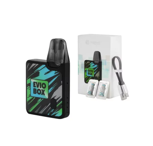 Joyetech EVIO Box POD kit – компактна POD-система, оснащена вбудованим акумулятором середньої ємкості, з можливістю перемикання потужності та розрахована на використання випаровувачів серії EN. Пристрій виконаний у вигляді невеликого квадрата з мундштуком, що виступає, тому займе мінімум місця в кишені або може носитися на шиї. Незважаючи на такі компактні розміри, у пристрої передбачена можливість вибору одного з трьох режимів потужності, що дуже тішить. Картриджі взаємозамінні з картриджами від раніше випущеної моделі Joyetech EVIO С, причому в них можна змінювати випаровувачі. Купити Joyetech EVIO Box POD kit можна у 10 кольорових варіантах - Flame, Jungle, Afterglow, Golden Flame, Golden Jungle, Golden Afterglow, White, Black, Blue, Cyan.