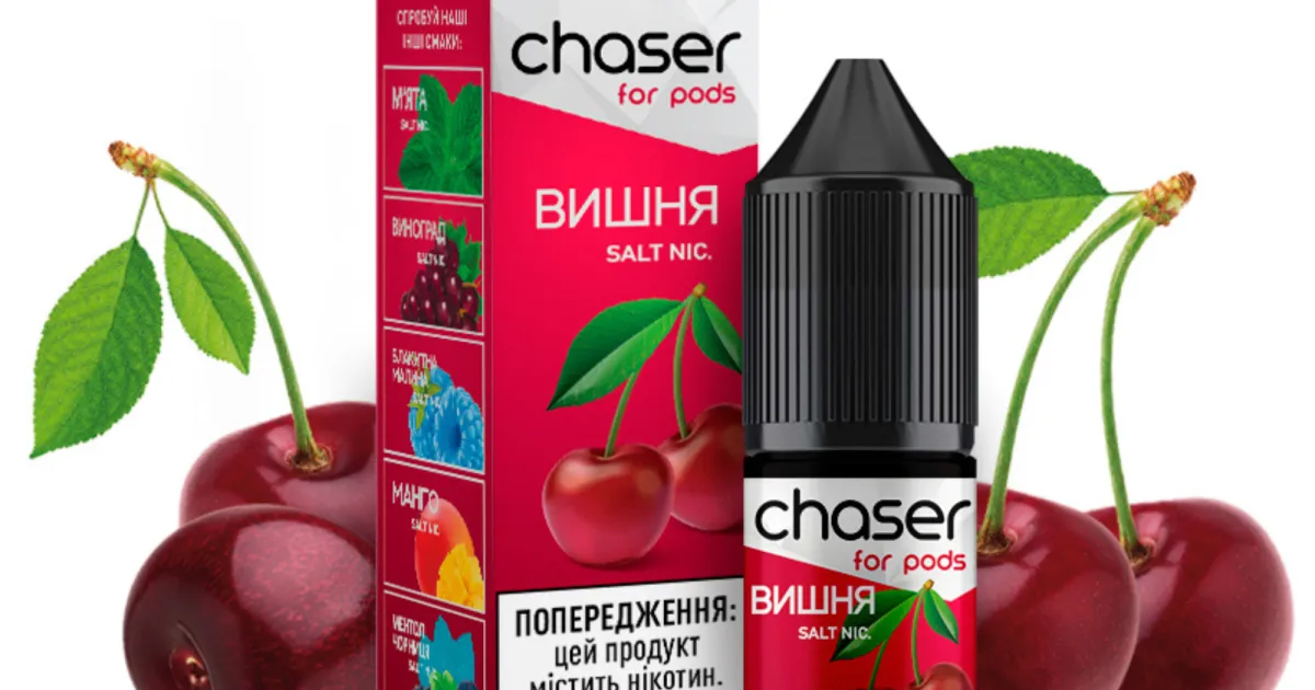 Рідина Чейзер для вейпу з ароматом вишні. Відчуйте смак стиглої та ароматної вишні з приємною кислинкою з Chaser For Pods полуниця 10 мл. Солодкий аромат вишні та легка кислинка ще довго відчуватиметься після паріння.
