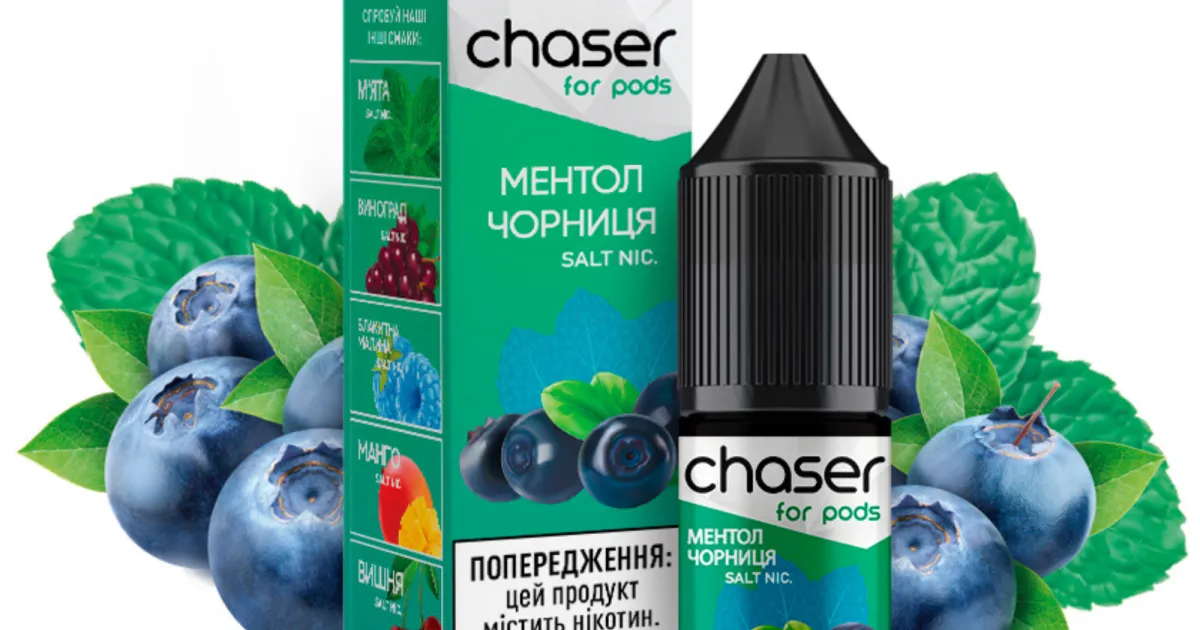 Рідина Чейзер для вейпу з ароматом чорниці з ментолом. Відчуйте смак лісової чорниці з виразним ментолом з Chaser For Pods чорниця ментол 10 мл. Освіжаючий смак ментолу в поєднанні зі спілою солодкою чорницею створюють неповторний тандем. Вдихаючи такий пар відчувається свіжість, а солодкий післясмак не відпускає ще тривалий час.